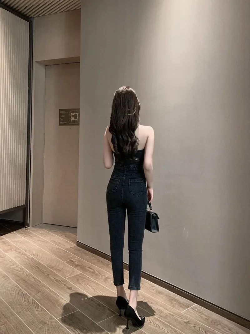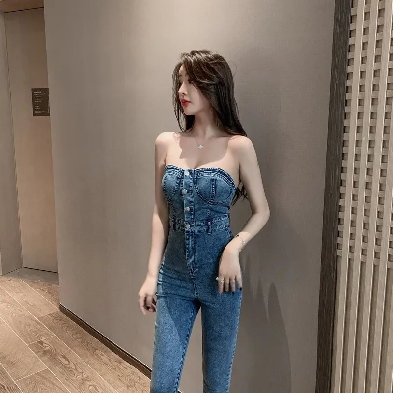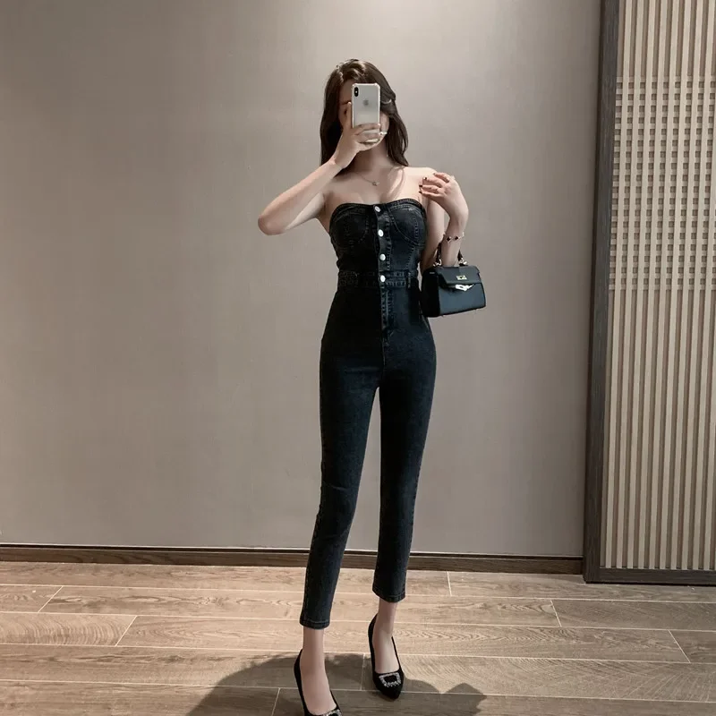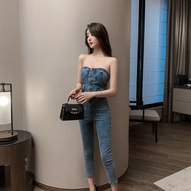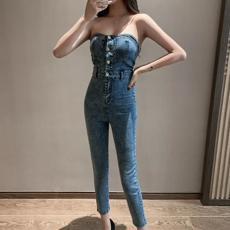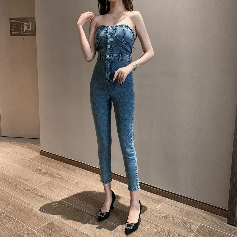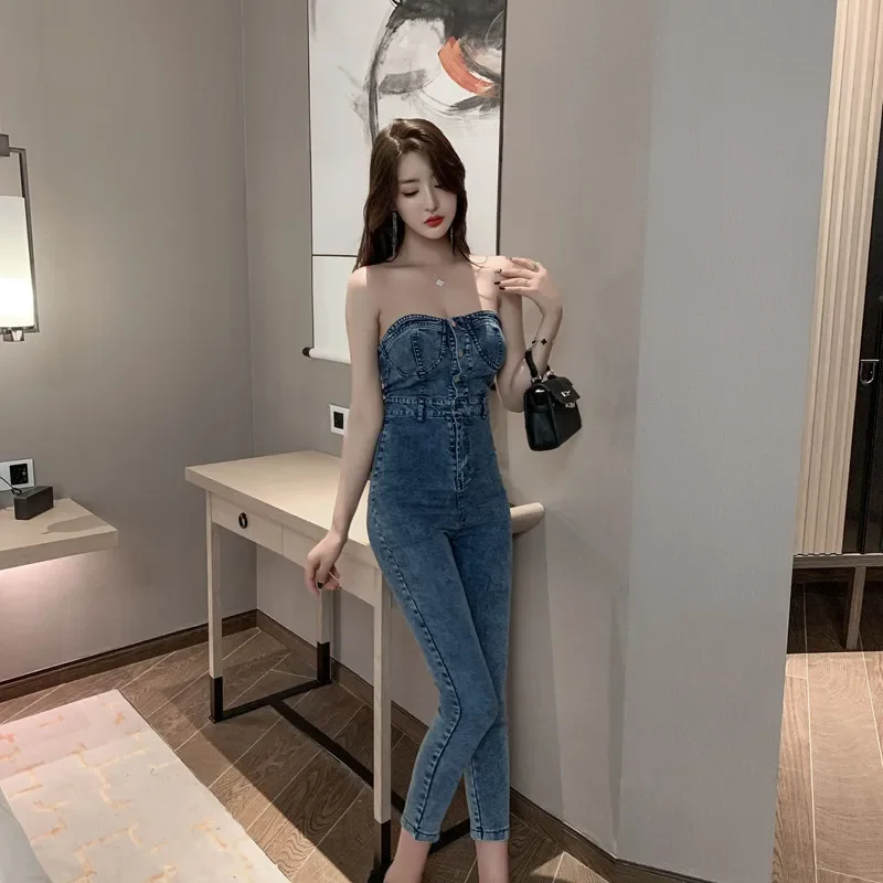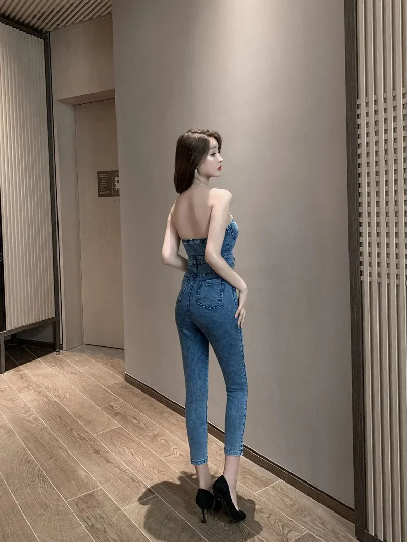 2023 Summer New Style Korean Version High-waisted Strapless Slimming Jeans For Women Small Foot Jumpsuit