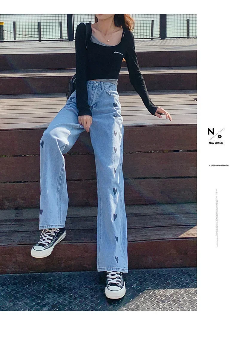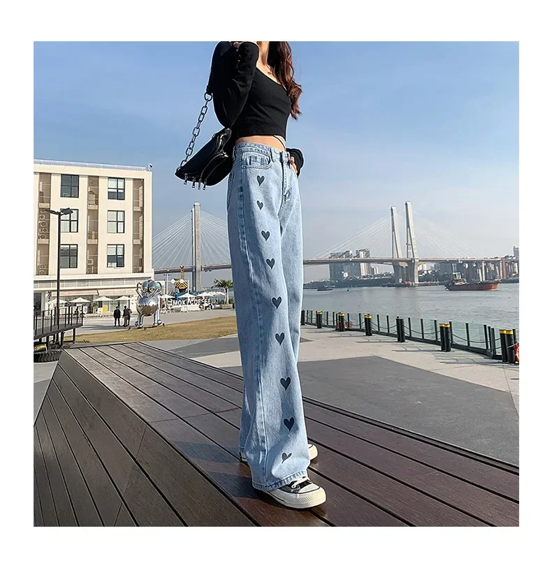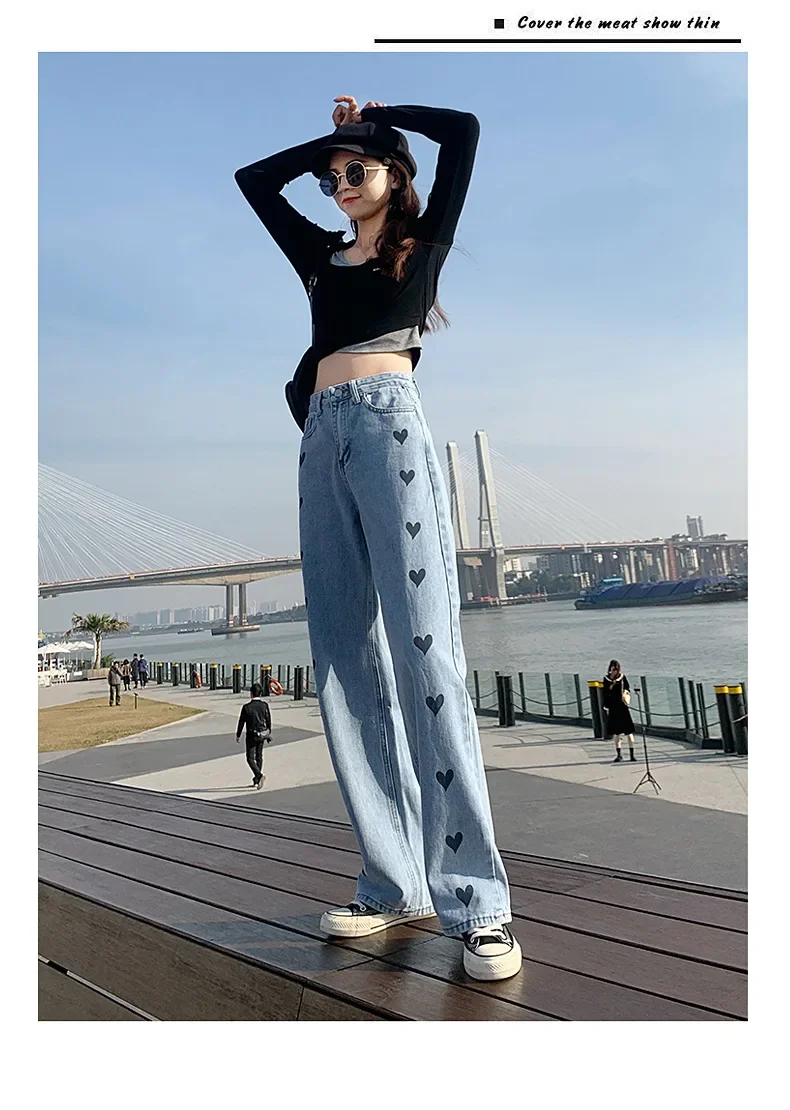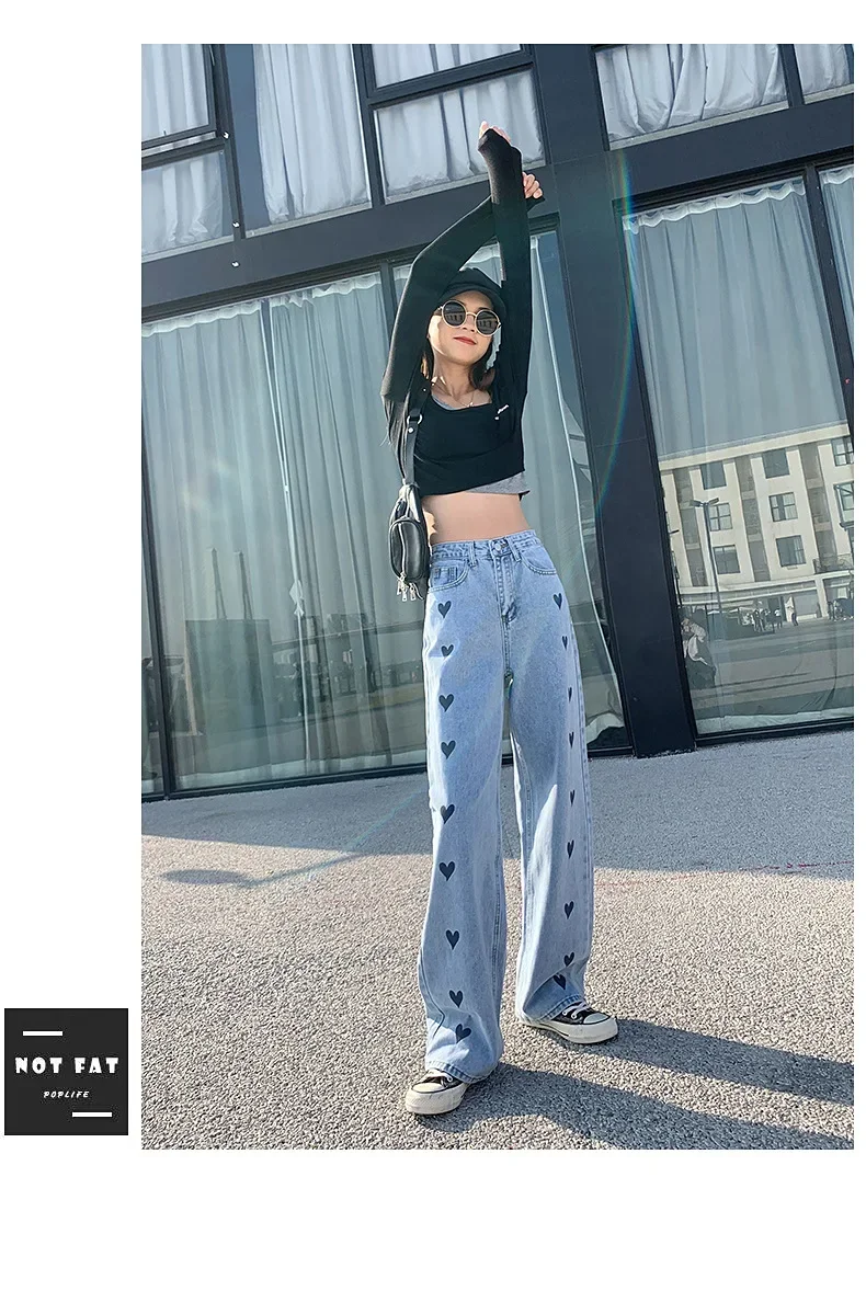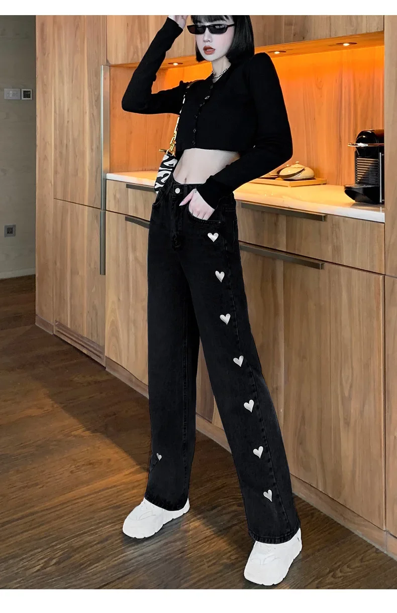 2024 New Style High-waisted Slimming Wide-leg Jeans Women's Straight-leg Loose-fit Heart Embroidery Draped Trailer Pants