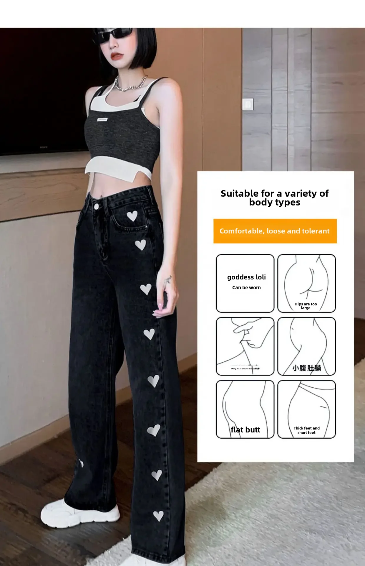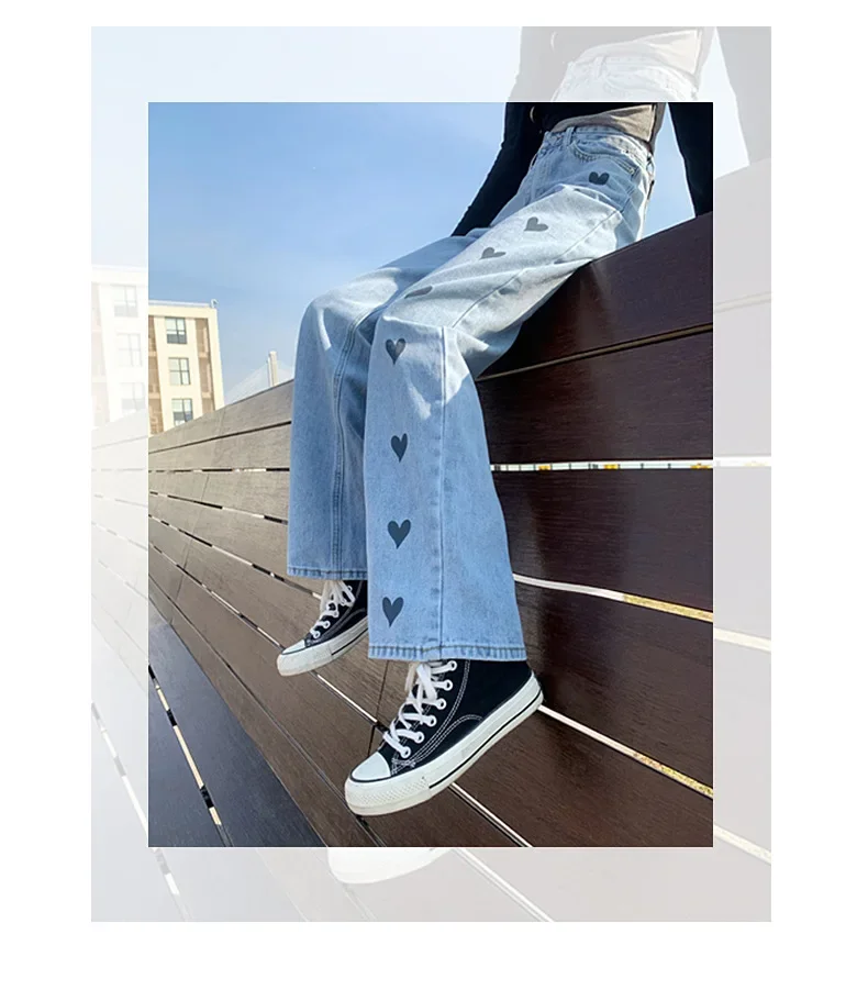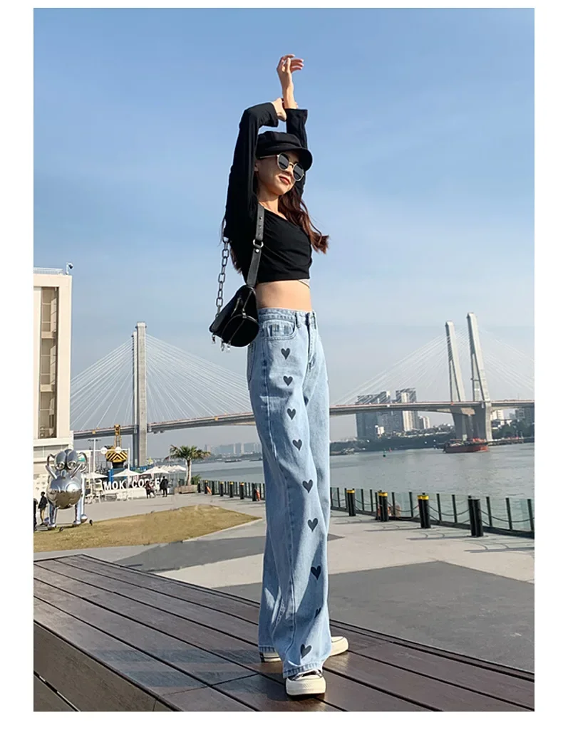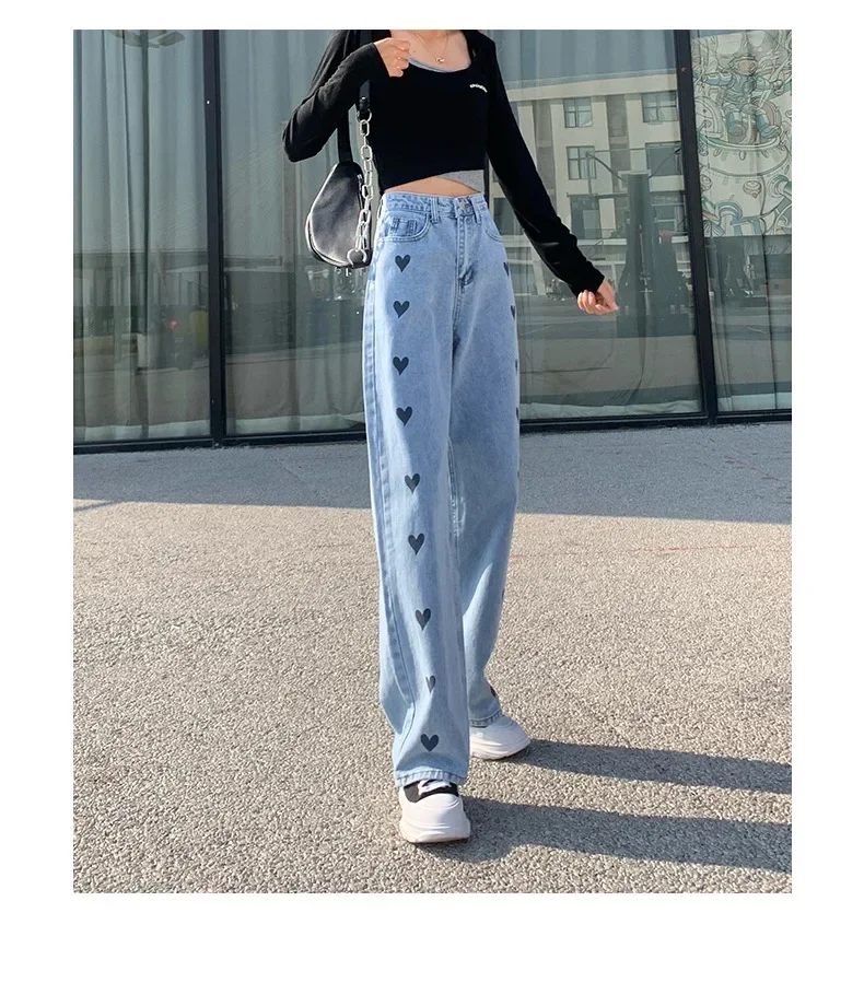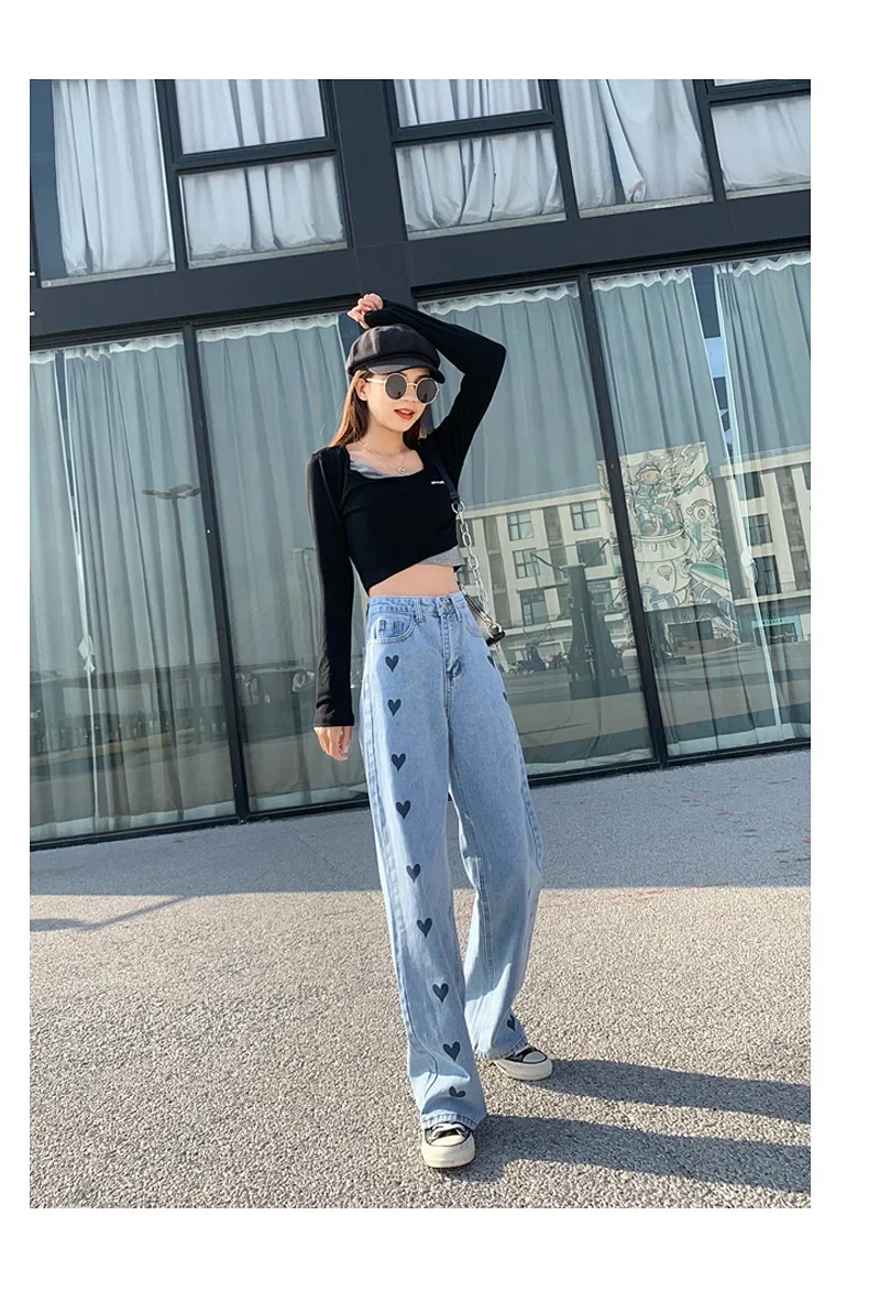 2024 New Style High-waisted Slimming Wide-leg Jeans Women's Straight-leg Loose-fit Heart Embroidery Draped Trailer Pants