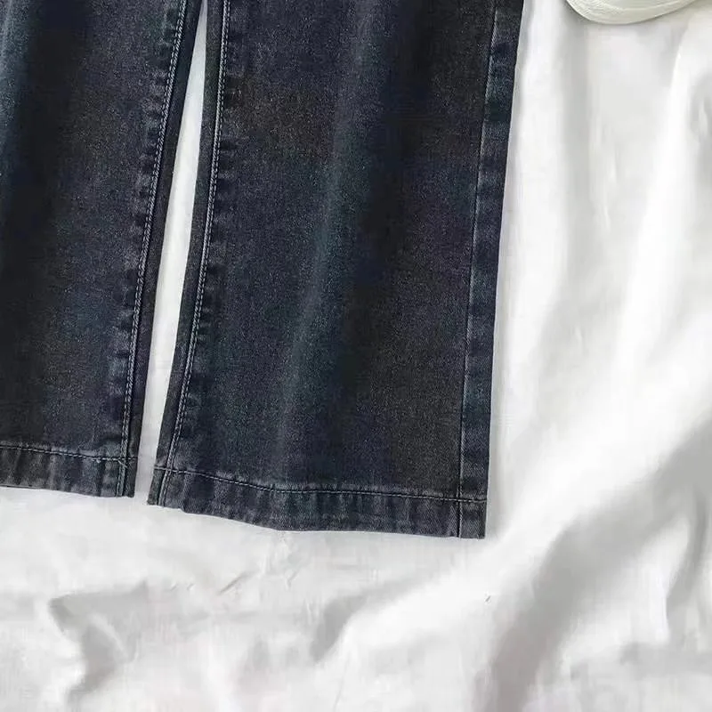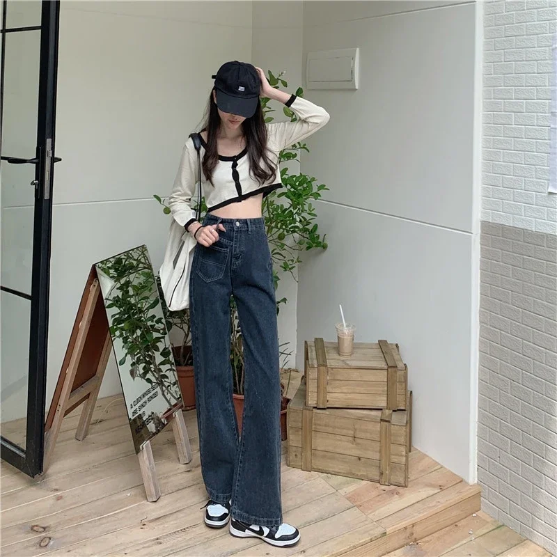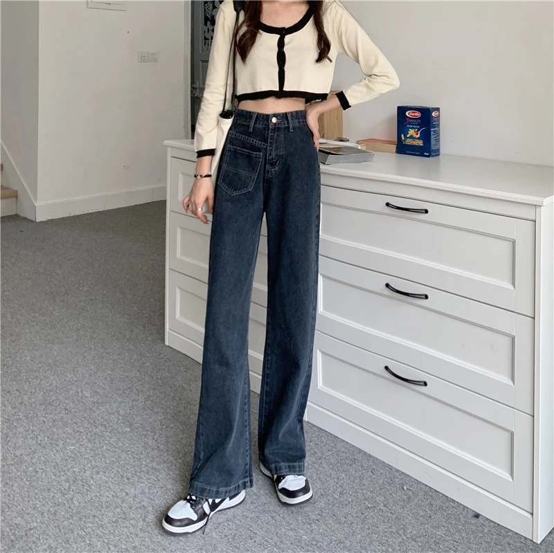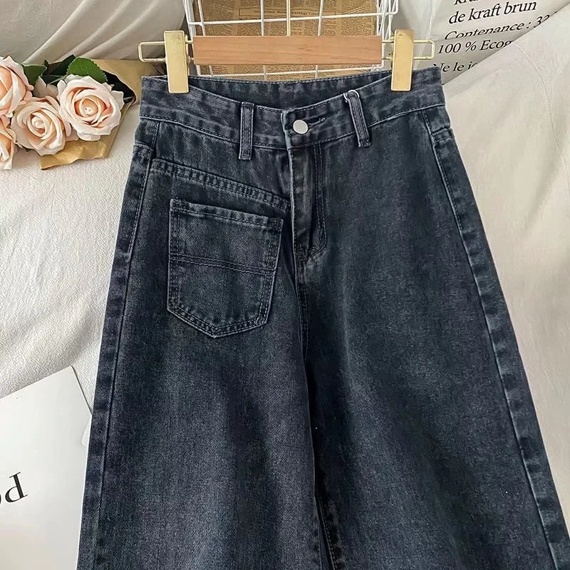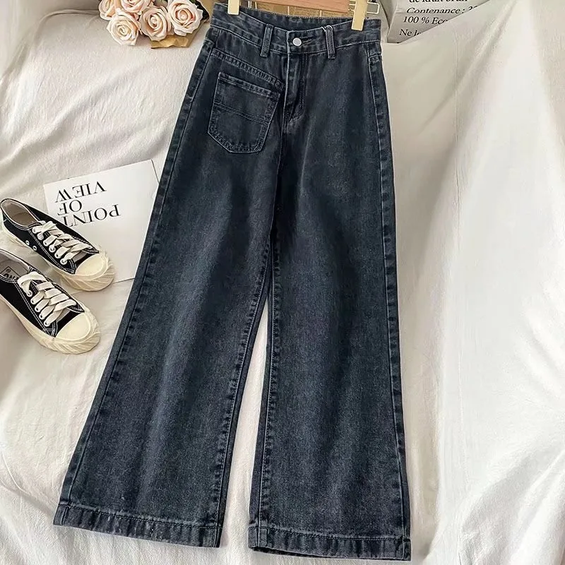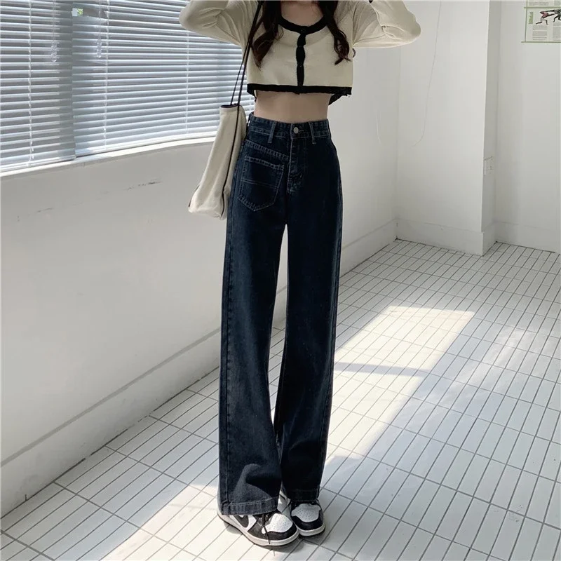 Autumn Spring Jeans Women Denim Pants Vintage Straight Trousers Fashion Female Solid Pocket Casual Jeans Wide Leg Pants