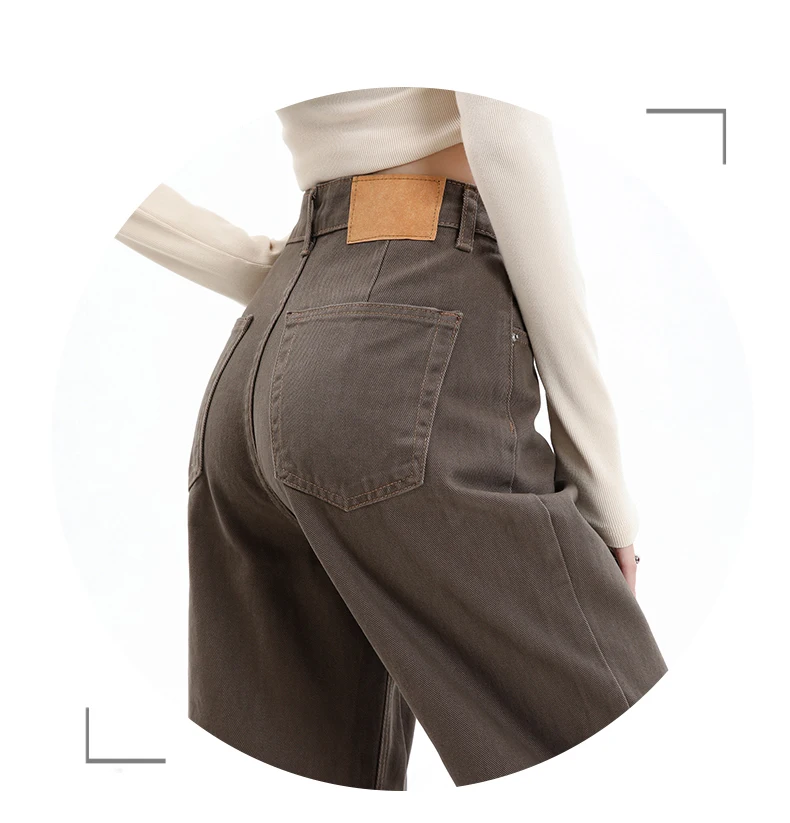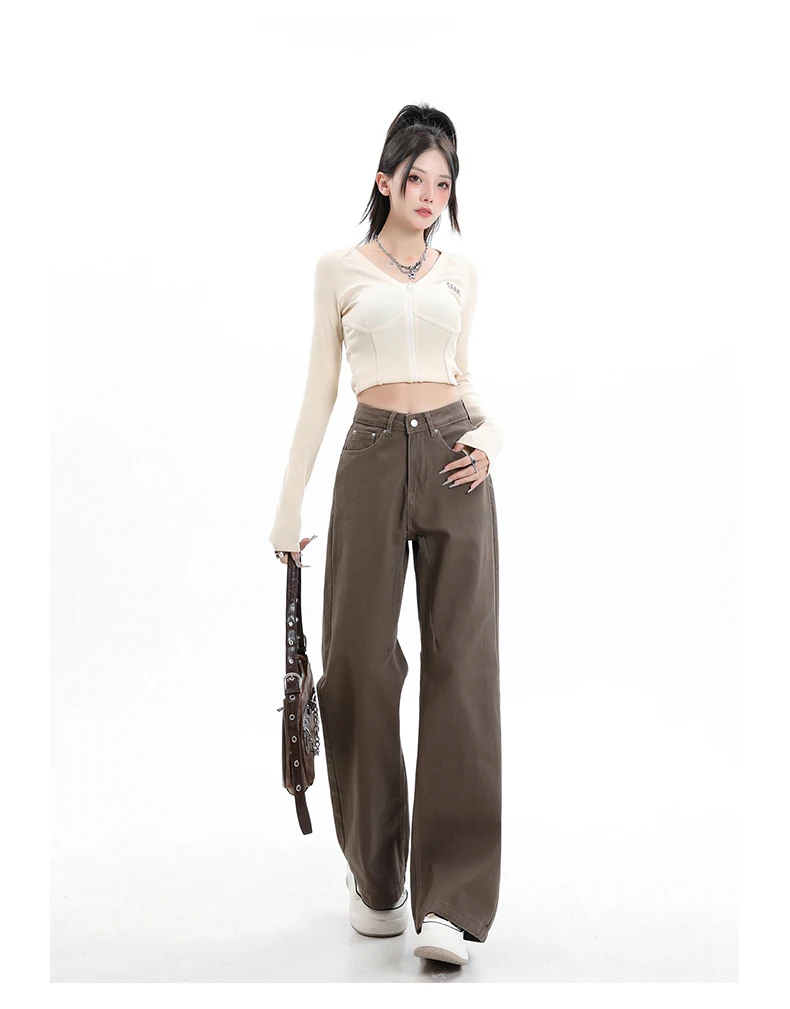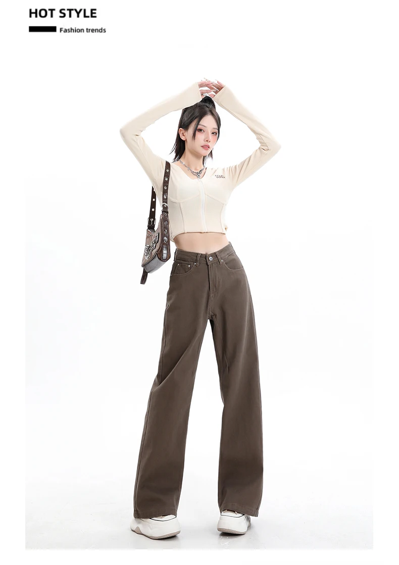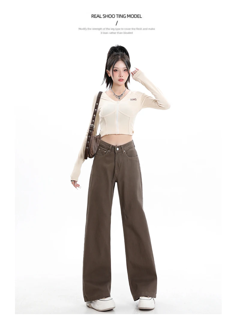Baggy High Street Fashion Straight brown Jeans for Women's Y2k High Waist Female Clothing Solid Color Casual Wide Denim Trousers