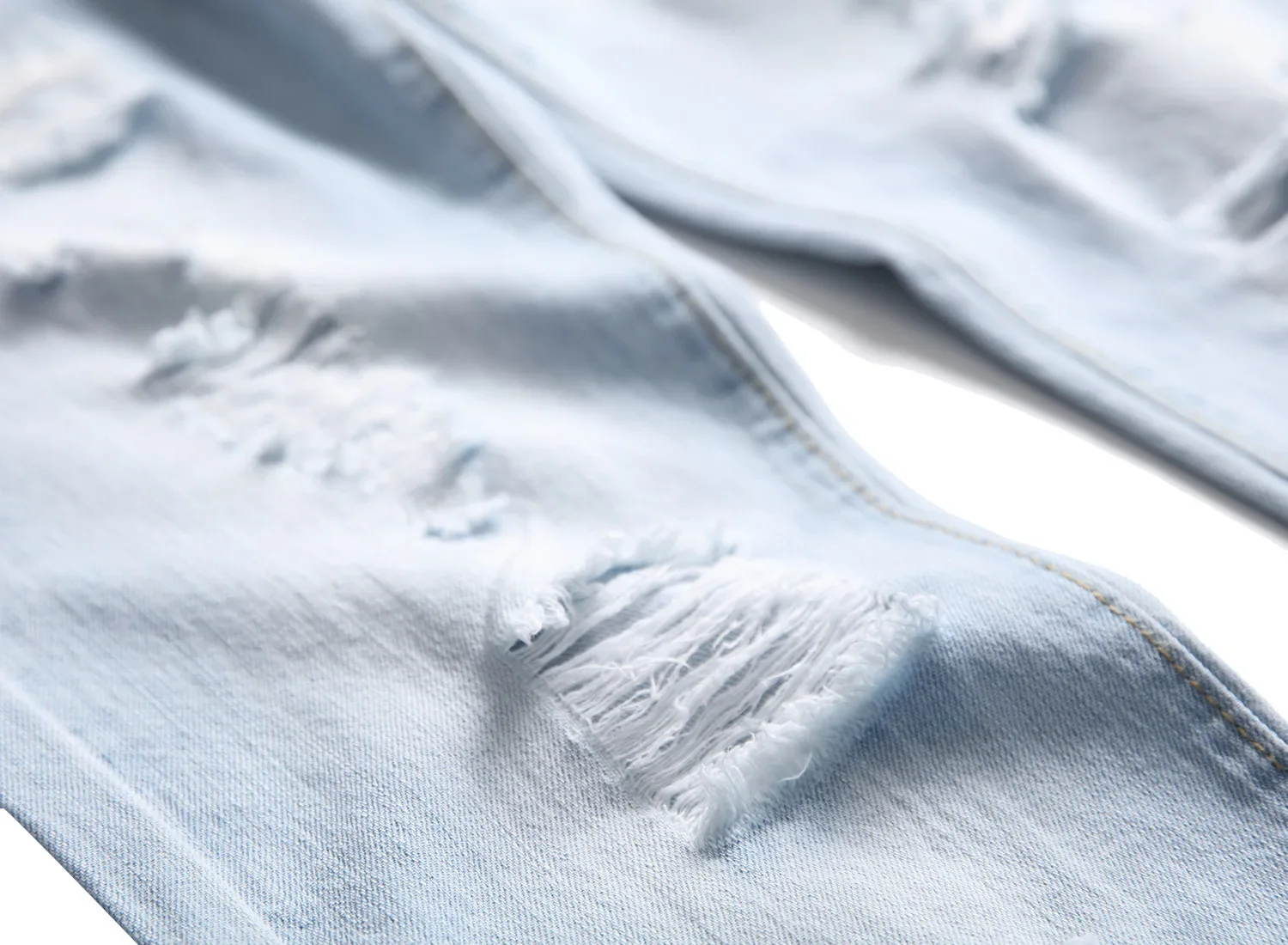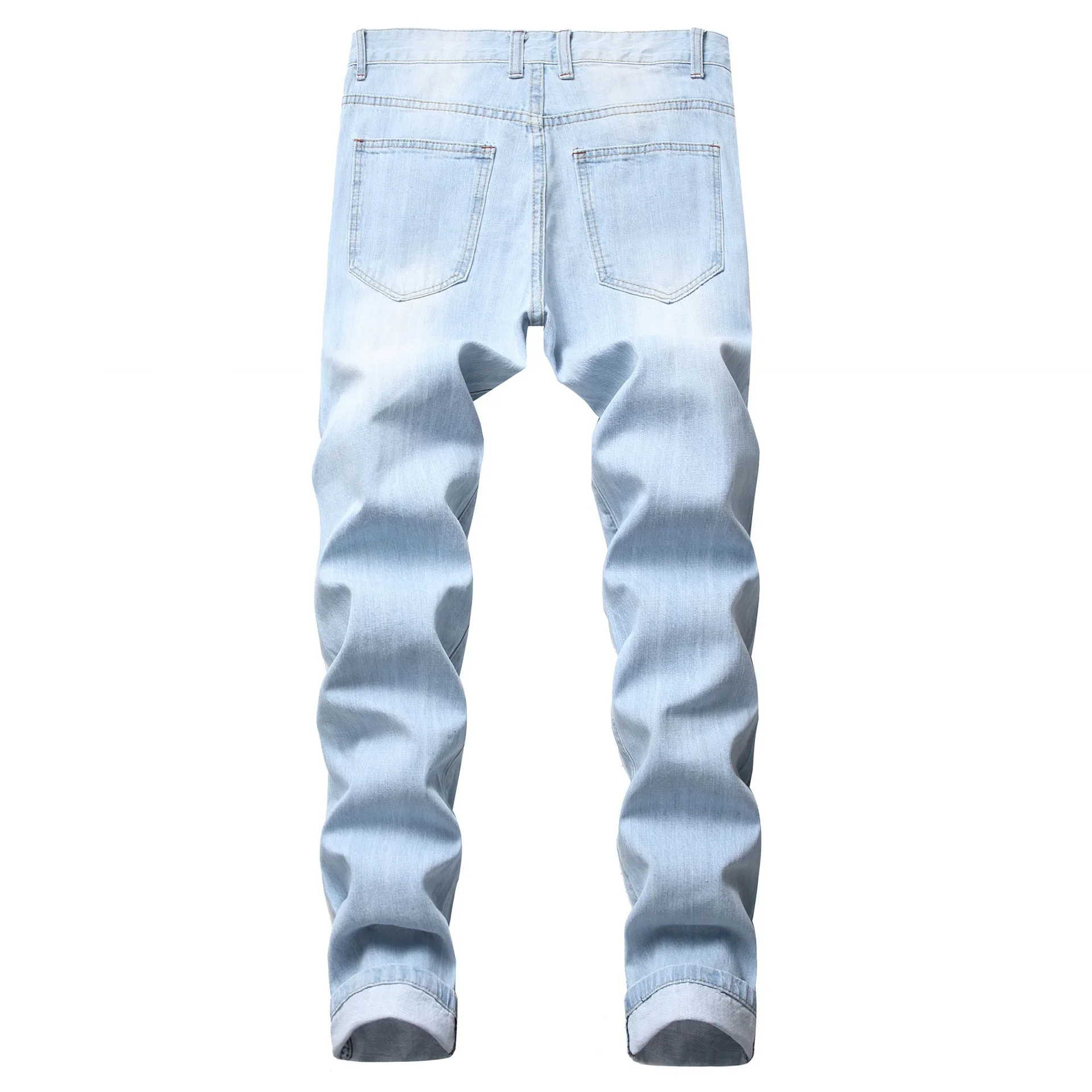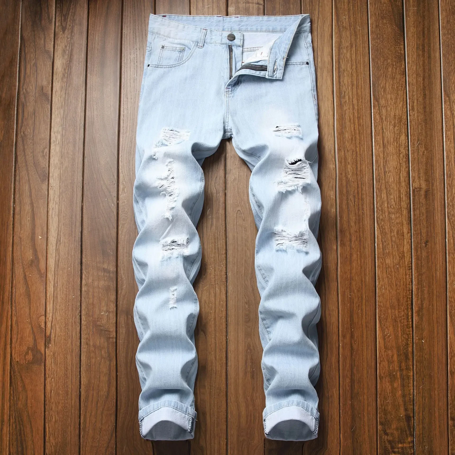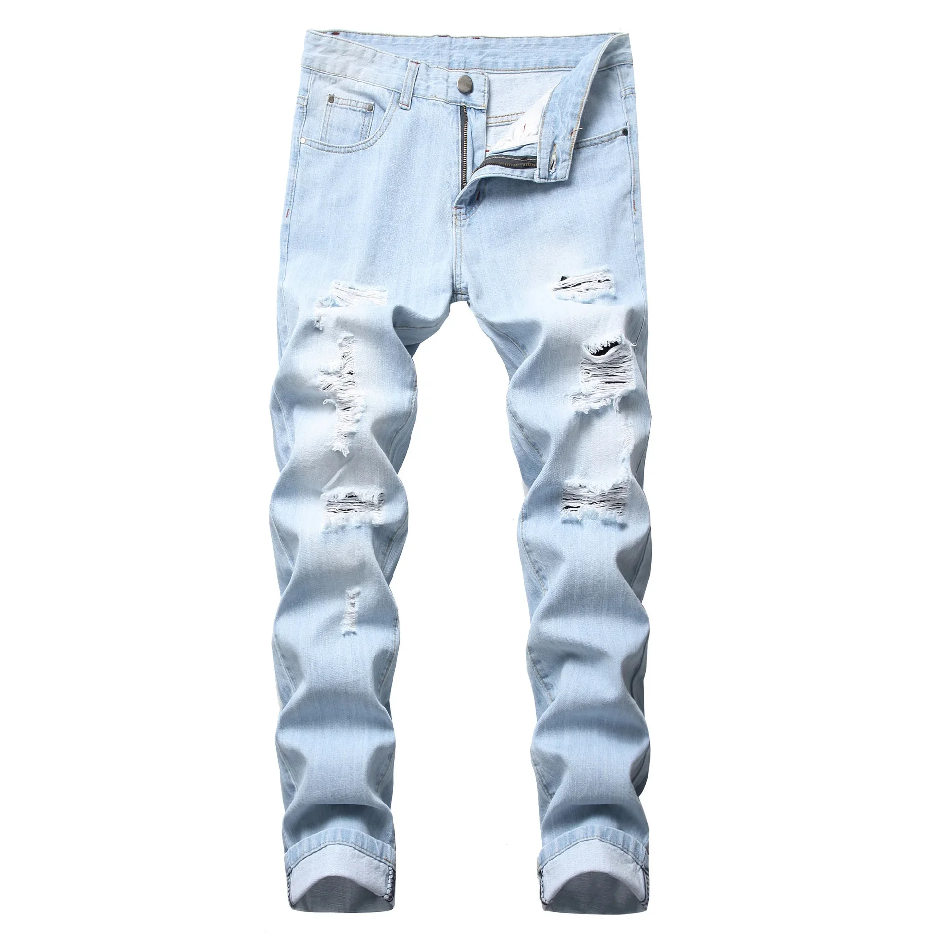 Cross-Border Men's Wear Ripped Straight-Leg Slim Fit Smooths Your Silhouette No Stretch Jeans Light-Colored Denim Trousers Amazo