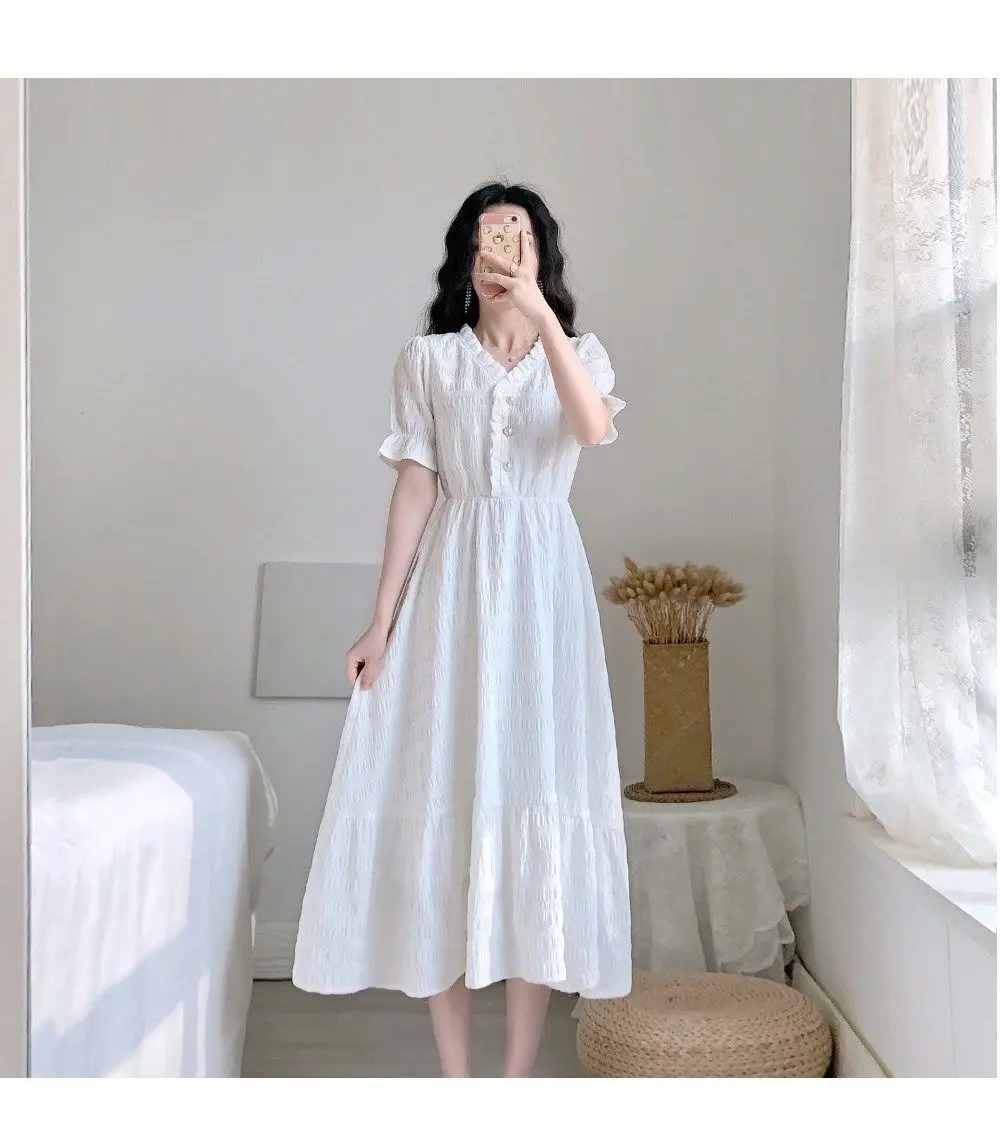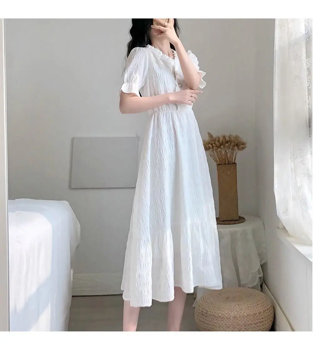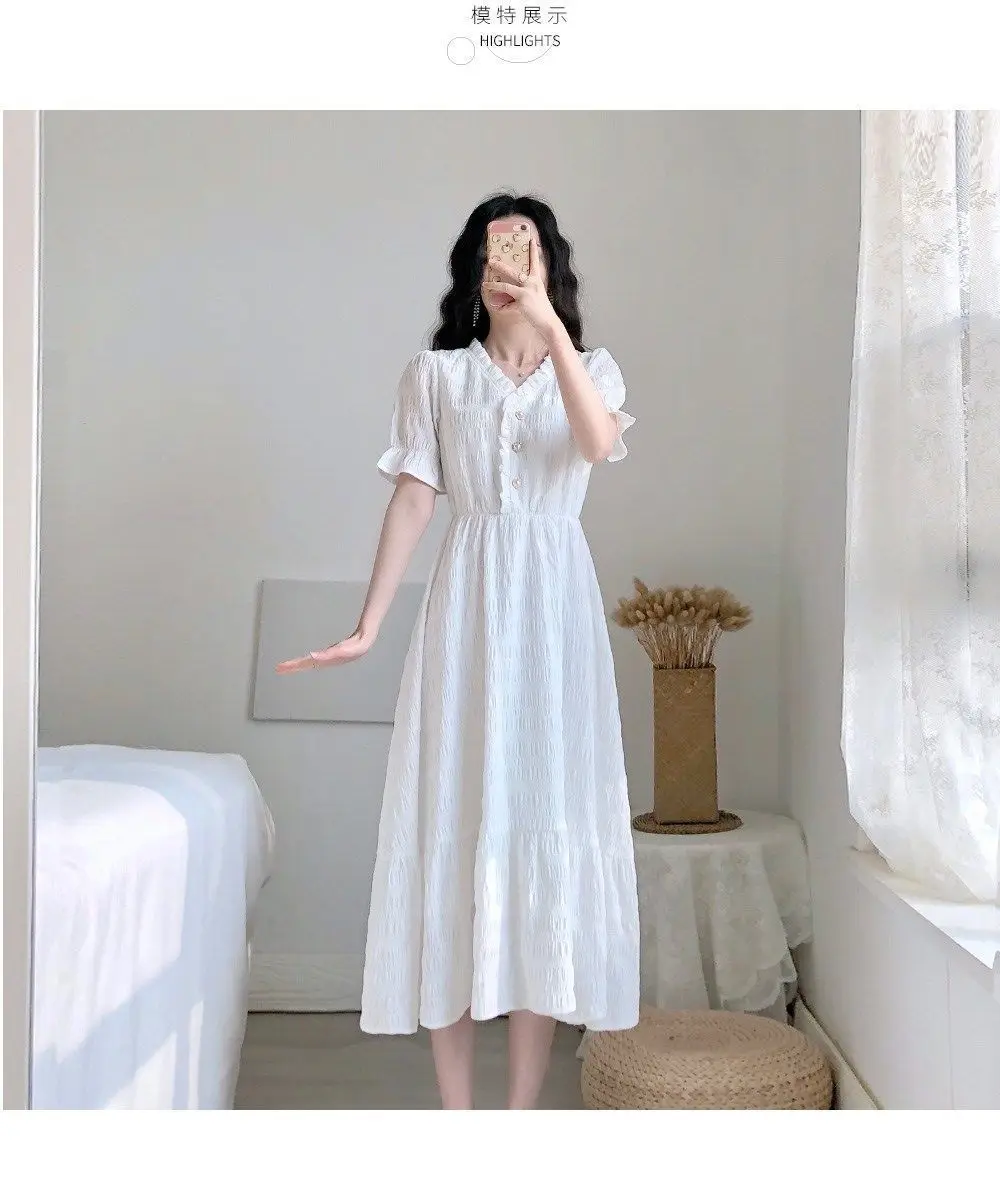 Dress for Women Summer Large Size Short Sleeve Shirt White Blue Dresses Casual Korean French Retro Slim Fit Female Clothing
