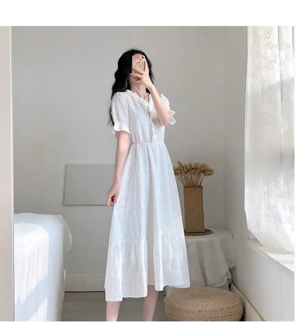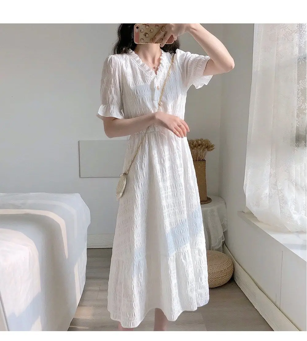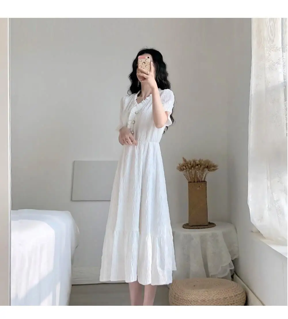 Dress for Women Summer Large Size Short Sleeve Shirt White Blue Dresses Casual Korean French Retro Slim Fit Female Clothing