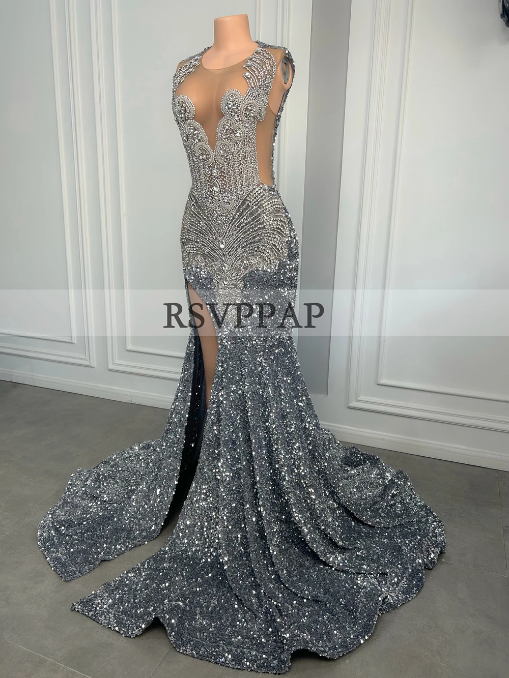 Long Sparkly Prom Dresses High Slit Luxury Diamond Silver Sequin