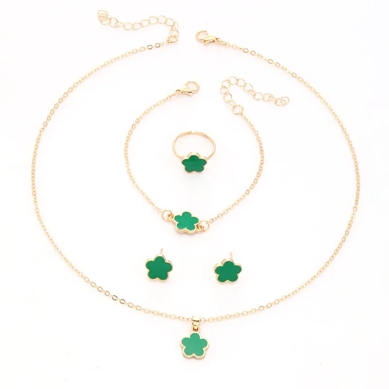 Lucky Five-petal Flower Clover Earrings Necklace Ring Bracelet Four-piece Set for Woman Fashionable Accessories Party Jewelry