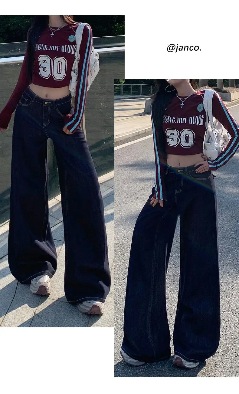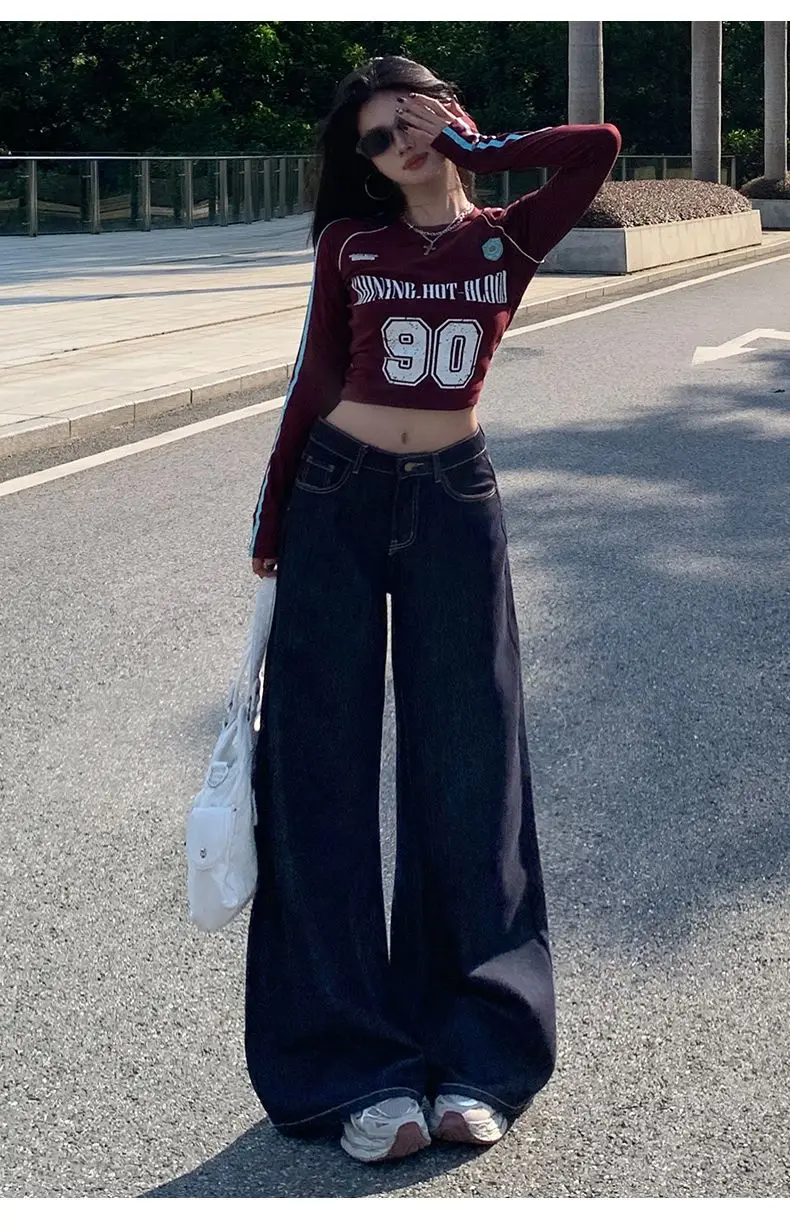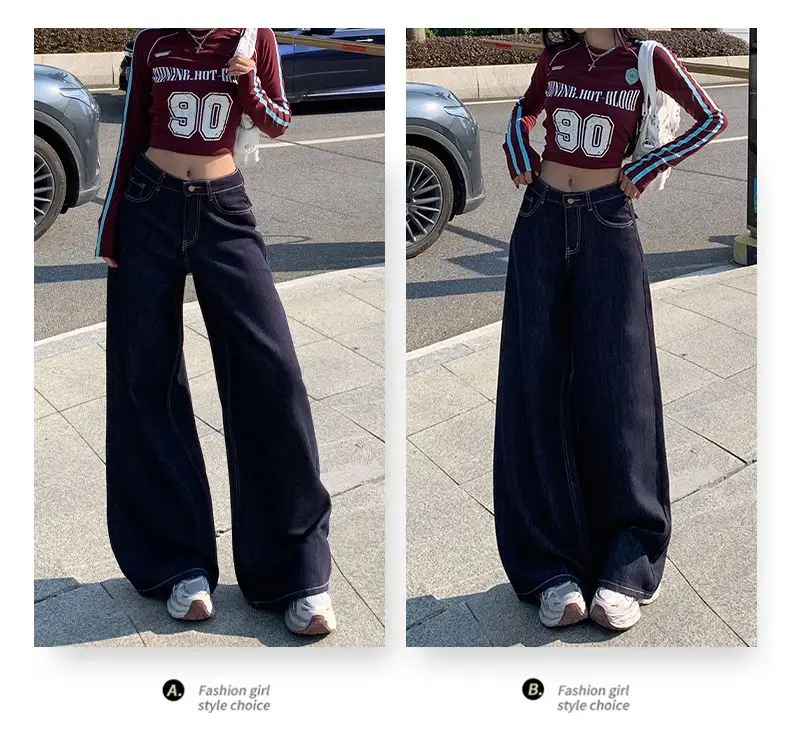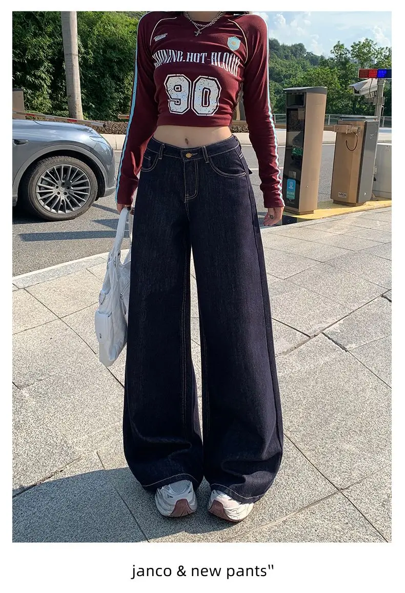 Lucyever Vintage Washed Wide Leg Jeans Women Deep Blue High Waist Baggy Y2K Denim Pants Lady Streetwear Casual Straight Trousers