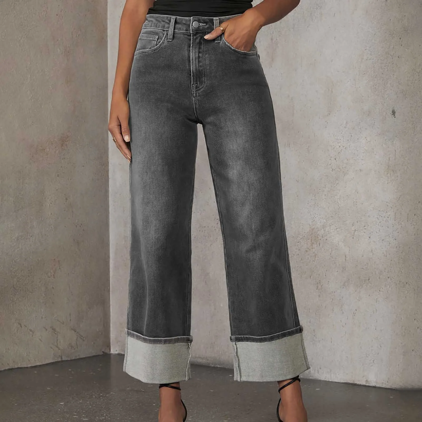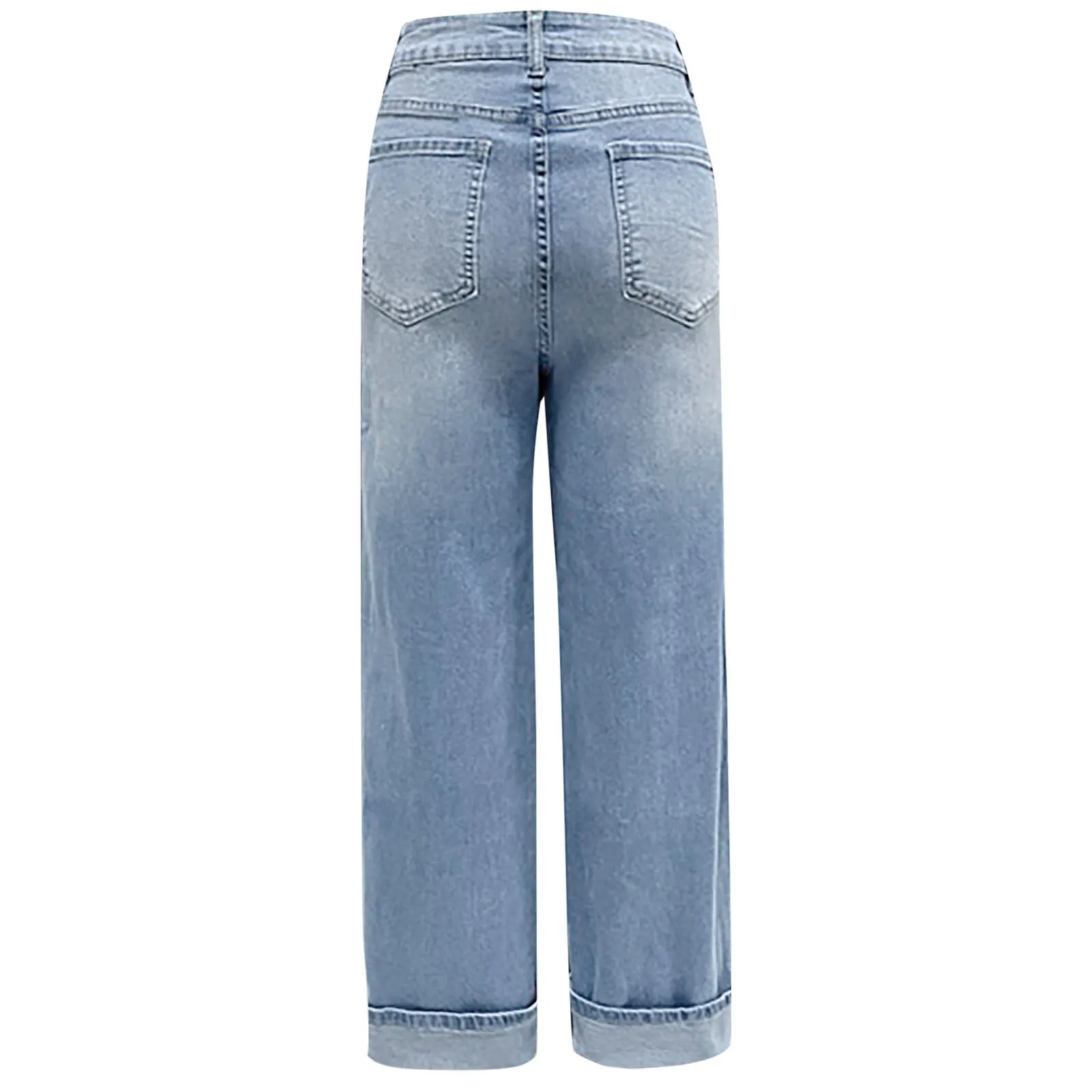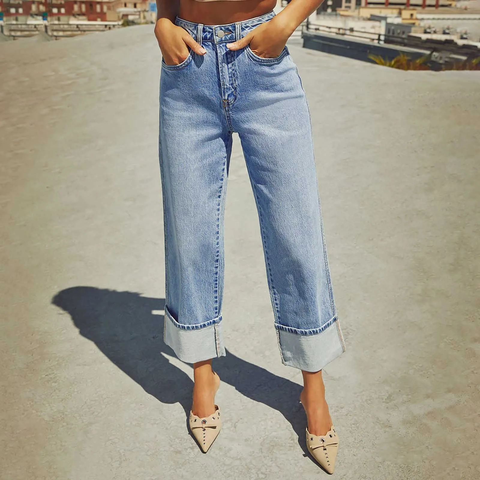 Women'S Casual Blue High Waist Wide Leg Straight Jean Pants New Trendy Loose Versatile Edge Curl Jeans Lady Commute Chic Pant