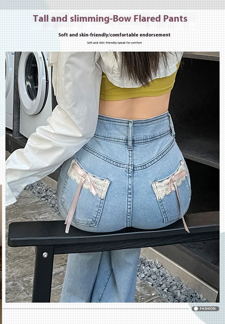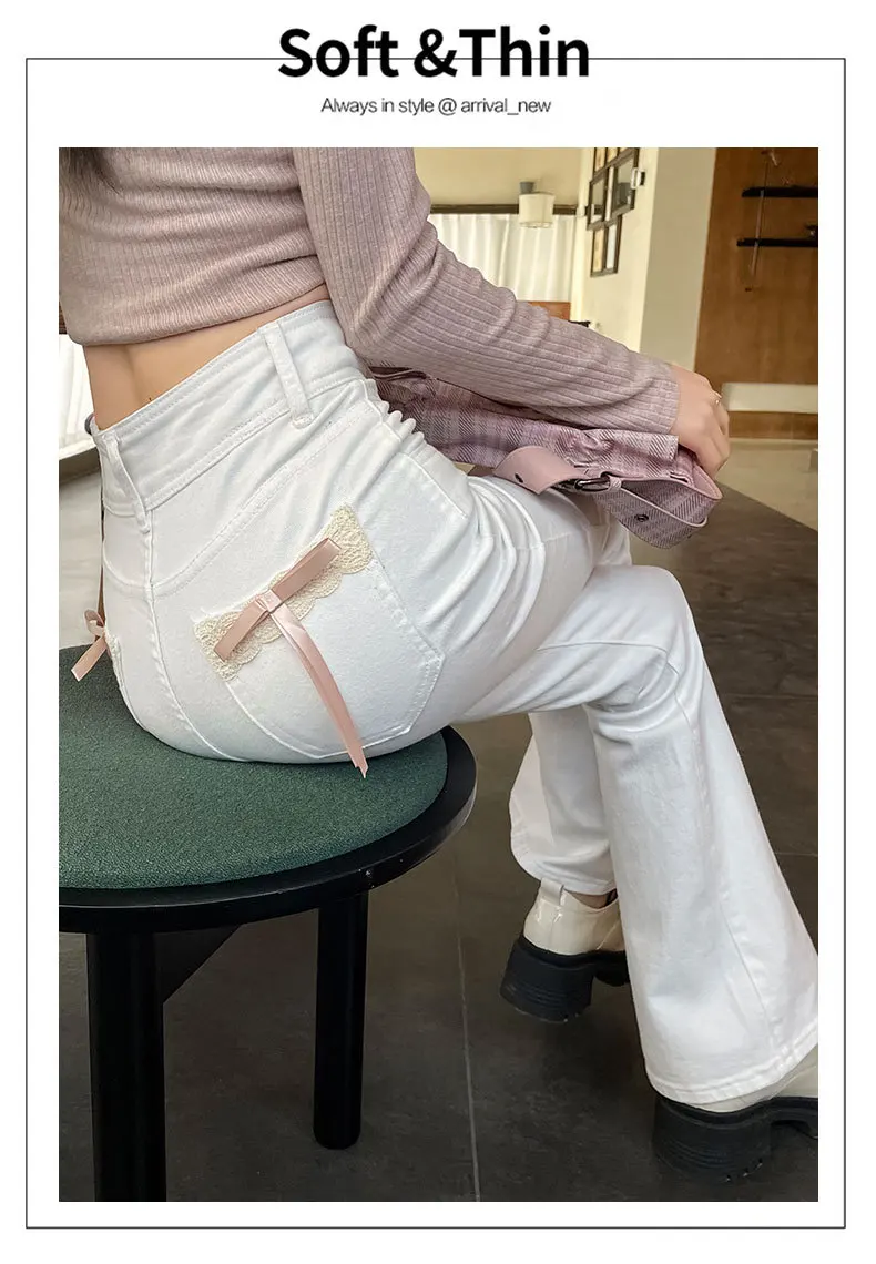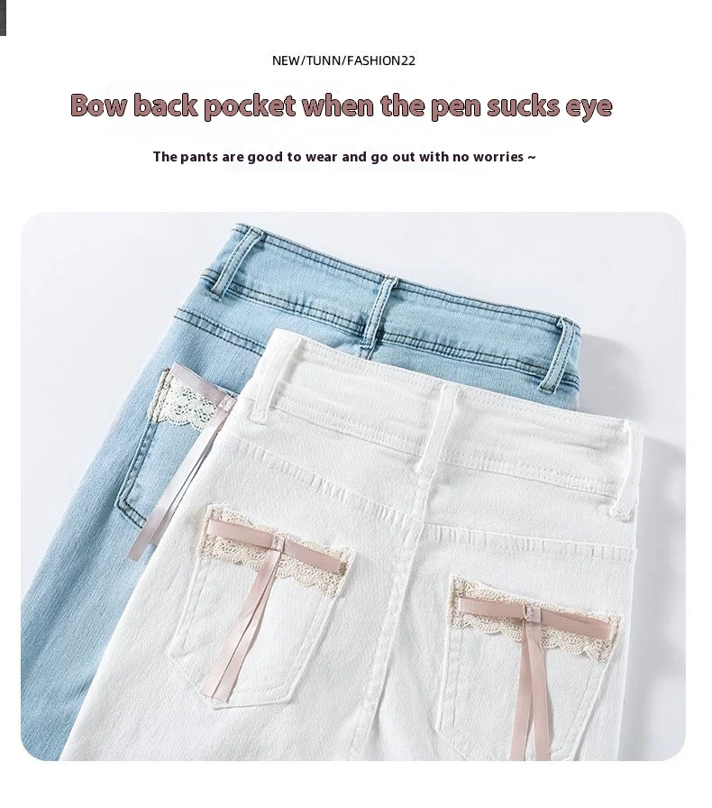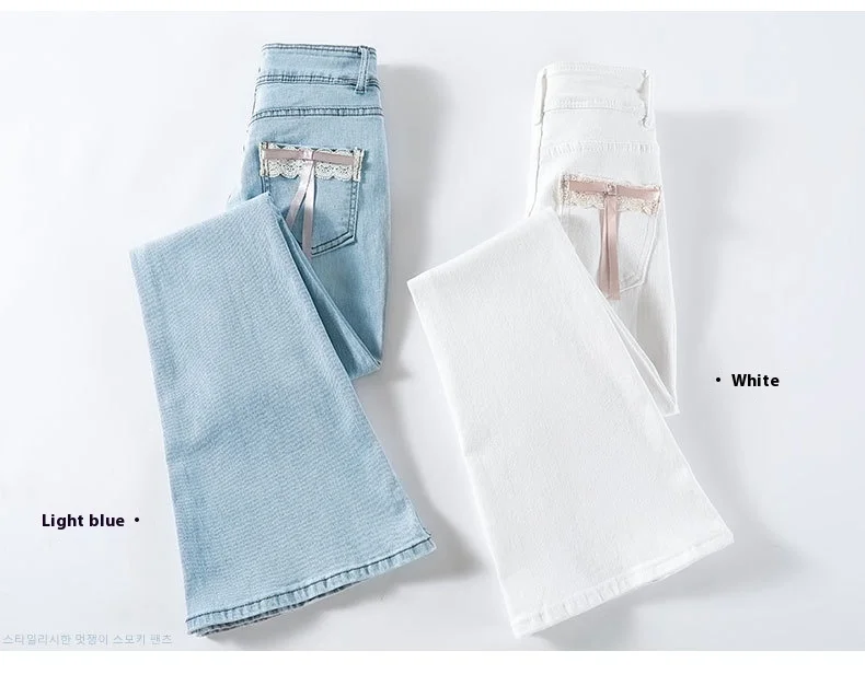 Women's New Slim Jeans Stretch Spice Girls Bow Lace Splicing Micro Jeans Female Slim High Waist Thin Horseshoe Pants Jeans