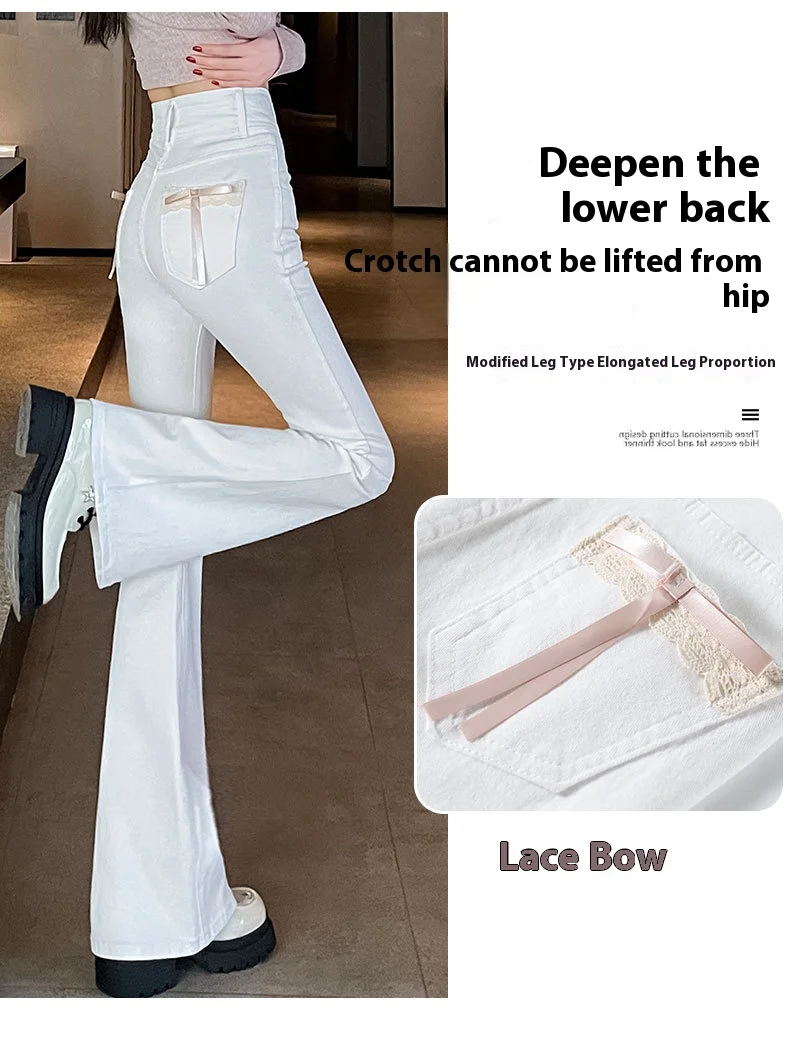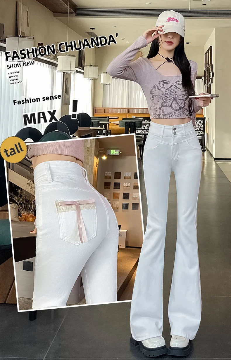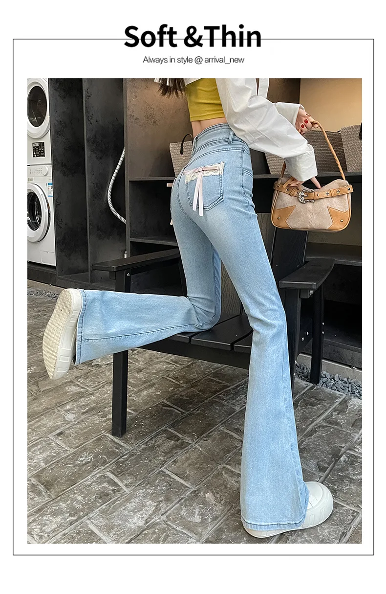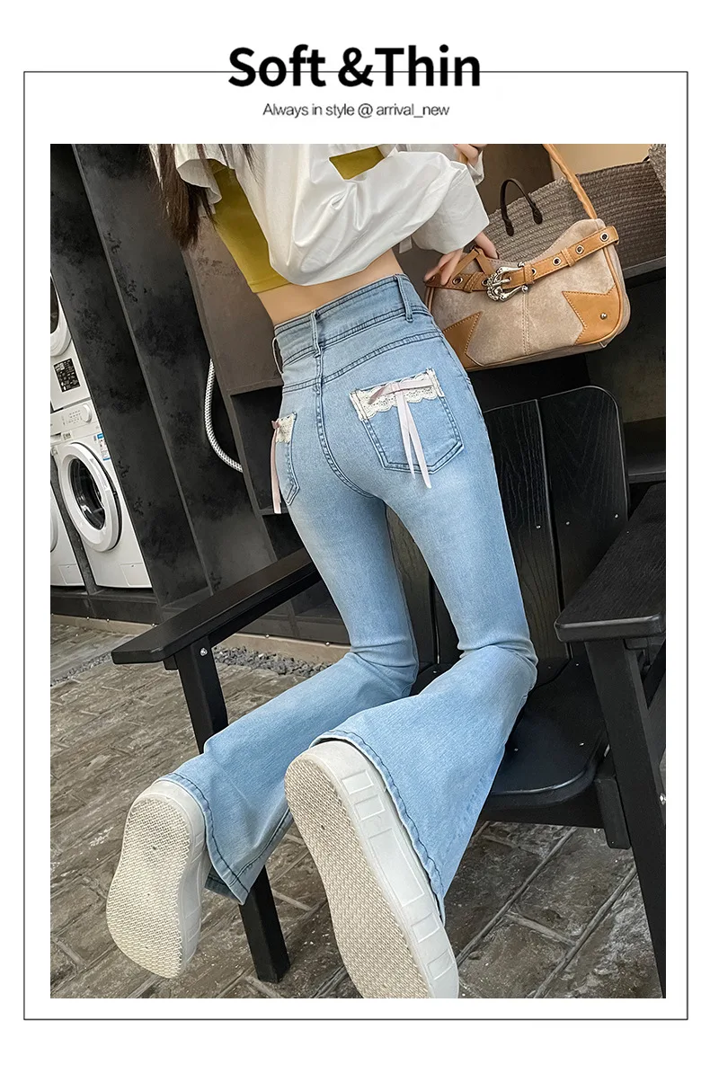 Women's New Slim Jeans Stretch Spice Girls Bow Lace Splicing Micro Jeans Female Slim High Waist Thin Horseshoe Pants Jeans